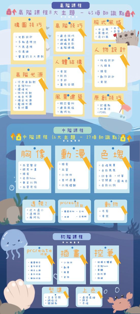 本畫室提供由淺入深的 Procreate 電繪課程,分為「初階」、「中階」和「高階」三個級別,讓零基礎同學都可以一步步建立穩固功底,再進階到人物設計、場景及原創創作。